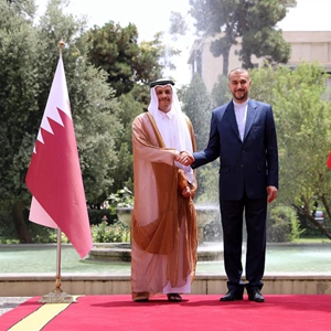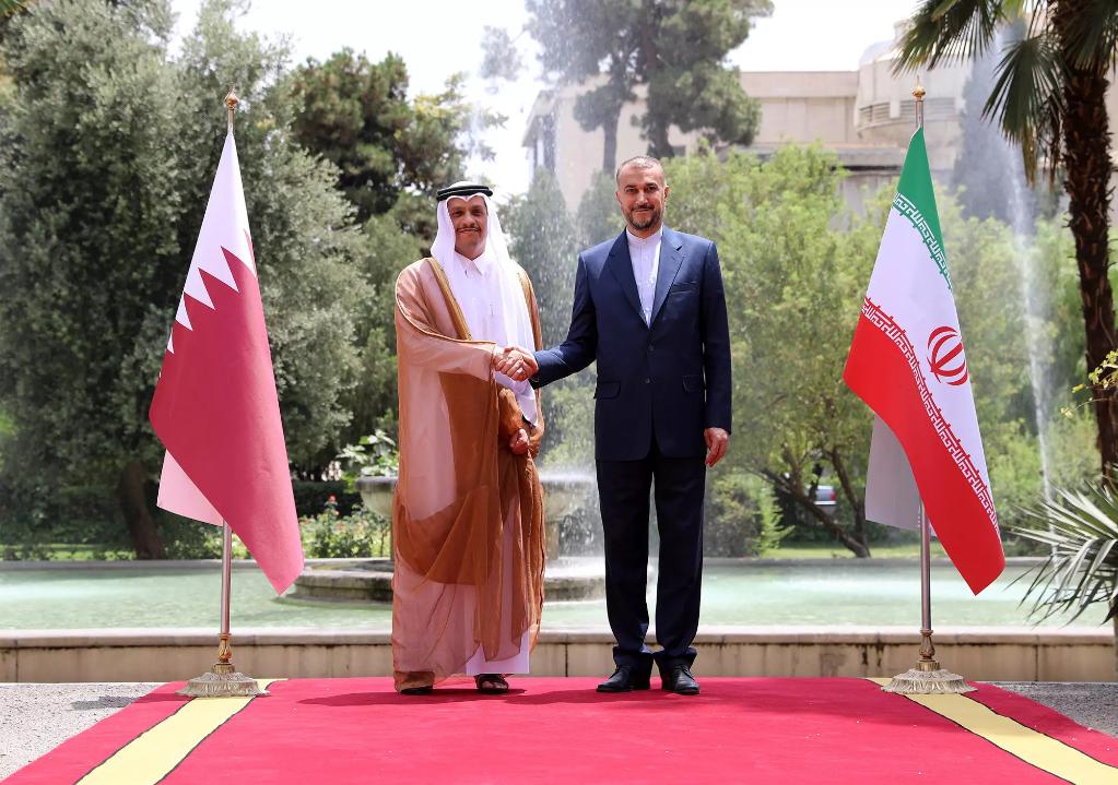 7月6日,伊朗外長(cháng)阿卜杜拉希揚(右)在德黑蘭歡迎到訪(fǎng)的卡塔爾副首相兼外交大臣穆罕默德。(新華社發(fā),伊朗外交部供圖