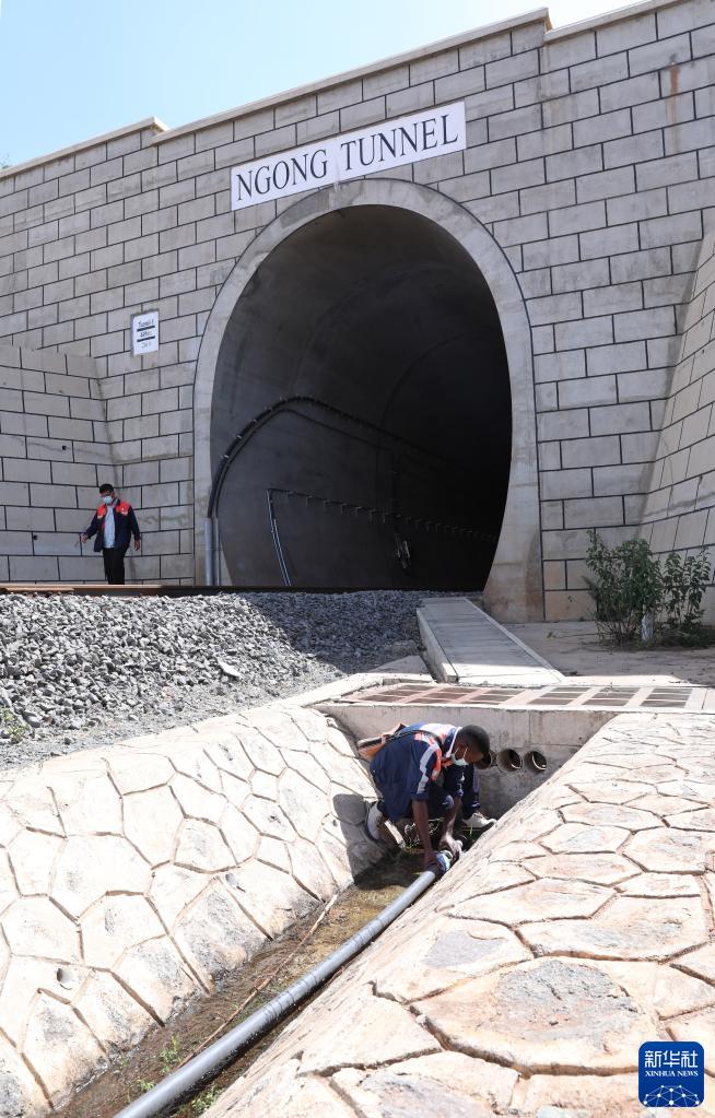 11月10日,一名工作人員在肯尼亞內馬鐵路恩貢隧道入口處維護水管。