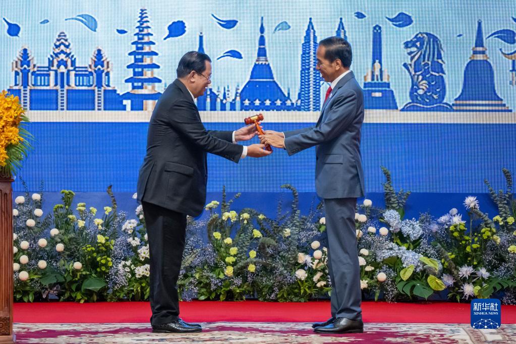 11月13日,在柬埔寨首都金邊,柬埔寨首相洪森(左)將東盟輪值主席木槌移交給2023年?yáng)|盟輪值主席國印度尼西亞總統佐科。