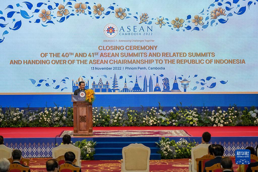 11月13日,柬埔寨首相洪森在柬埔寨首都金邊舉行的閉幕式上致辭。