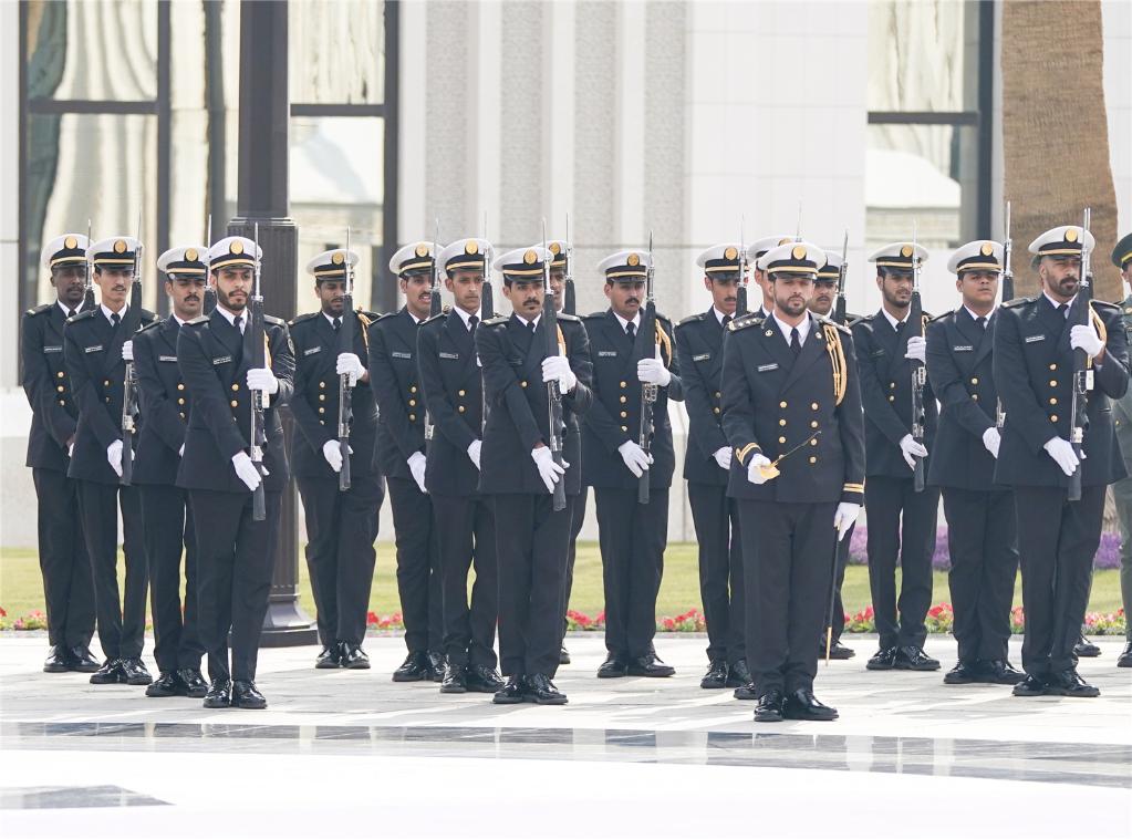 沙特王儲兼首相穆罕默德在下車(chē)處熱情迎接。兩國領(lǐng)導人步入檢閱亭,王宮軍樂(lè )團奏中沙兩國國歌。