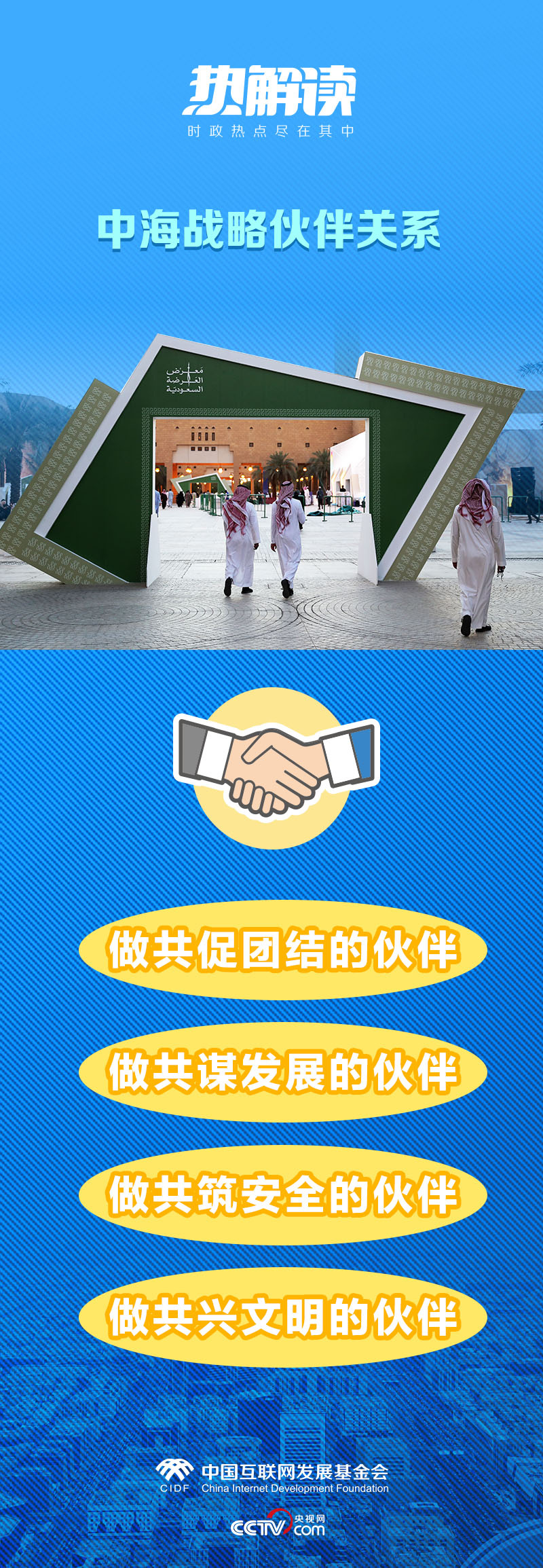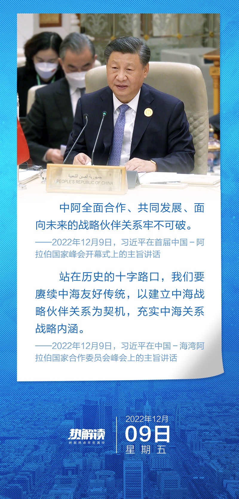 “帶著(zhù)中國人民的深情厚誼,我再次來(lái)到利雅得,同阿拉伯朋友一道召開(kāi)首屆中國-阿拉伯國家峰會(huì )、中國-海灣阿拉伯國家合作委員會(huì )峰會(huì ),并對沙特進(jìn)行國事訪(fǎng)問(wèn)?!痹陬}為《傳承千年友好,共創(chuàng )美好未來(lái)》的署名文章中,習主席開(kāi)宗明義指出此次中東之行的目的是發(fā)揚光大中阿、中海、中沙傳統友好,開(kāi)啟中國同阿拉伯世界、海灣阿拉伯國家、沙特阿拉伯關(guān)系新時(shí)代。