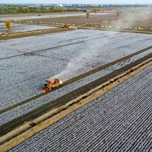采棉機在新疆沙雅縣海樓鎮的棉田里采收棉花(2022年11月10日攝,無(wú)人機照片)。新華社發(fā)(柳玉柱 攝)