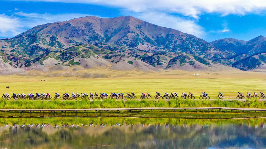 自行車(chē)賽選手在新疆賽里木湖國家濕地公園騎行(2022年7月26日攝,無(wú)人機照片)。新華社發(fā)(于蘇甫·艾尼 攝)