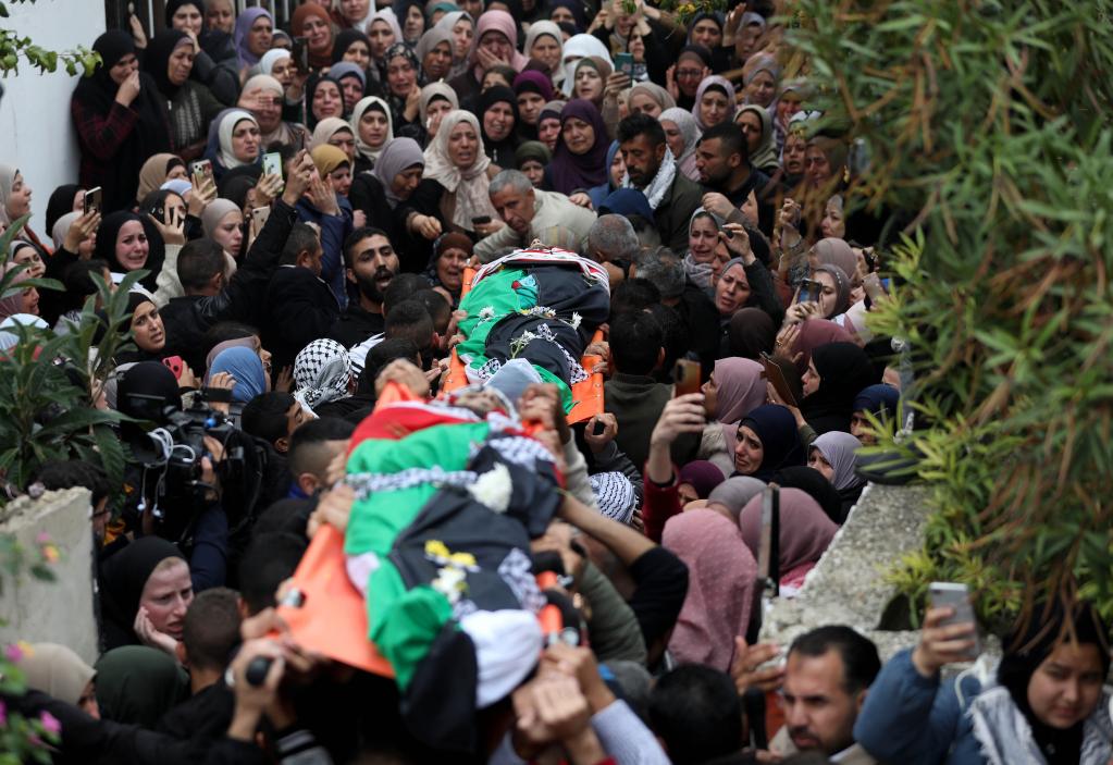 11月29日,在約旦河西岸城市拉姆安拉附近的拜特里馬,人們?yōu)楸灰陨熊婈牬蛩赖陌屠账固谷怂驮帷?/span>新華社發(fā)(艾曼·努巴尼攝)