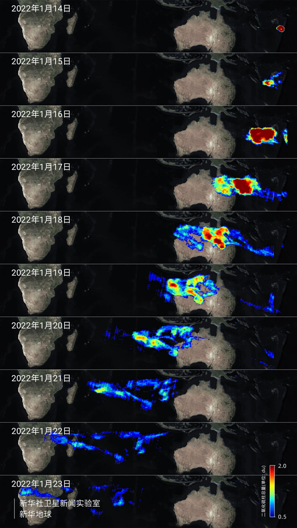 2022年1月,“高分五號”衛星觀(guān)測到湯加洪阿哈阿帕伊島海底火山噴發(fā)后產(chǎn)生的二氧化硫氣團飛越澳大利亞、印度洋,抵達非洲大陸西海岸。這次火山噴發(fā)是有儀器記錄以來(lái)地球大氣層內發(fā)生的“最大爆炸”。