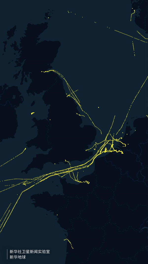 2022年9月26日,法國海岸,衛星和陸基接收站獲取的液化天然氣運輸船航行軌跡(船舶自動(dòng)識別系統AIS)。這些船只大部分來(lái)自美國。在發(fā)起對俄羅斯的制裁后,美國以原價(jià)數倍的價(jià)格向法國和其他歐洲國家銷(xiāo)售天然氣。這使法國、德國經(jīng)濟出現近千億歐元損失,也使??松梨?、雪佛龍等美國能源巨頭沖擊歷史最高利潤紀錄。