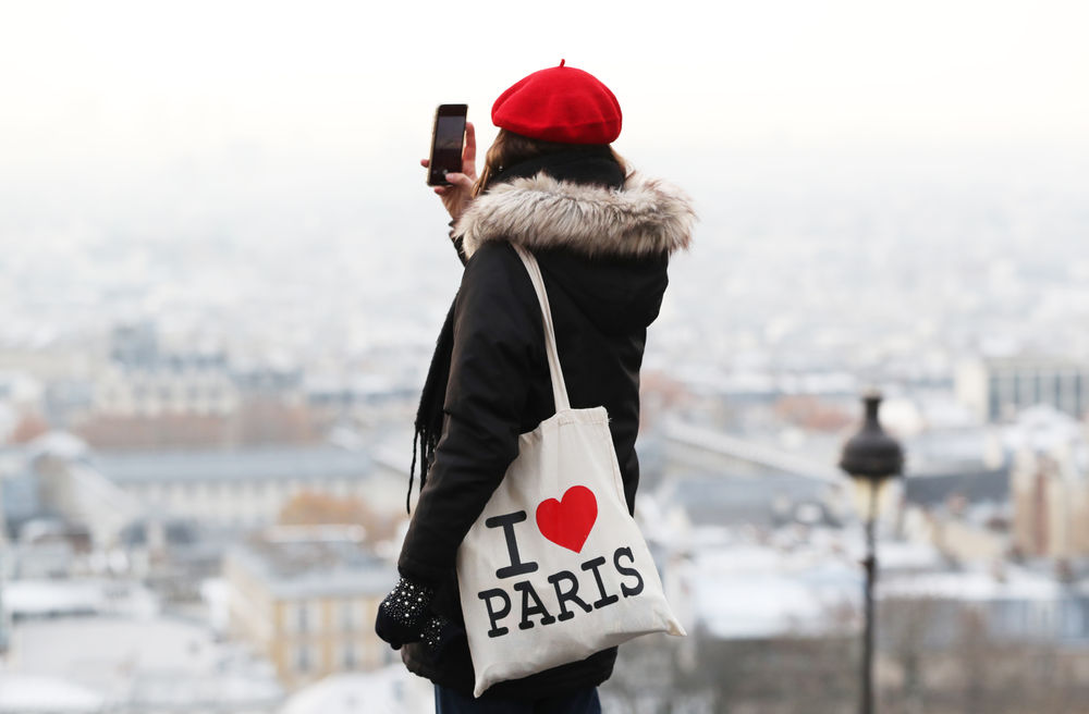 ↑2022年12月14日,一名女子在法國巴黎蒙馬特高地拍攝小雪后的巴黎城。