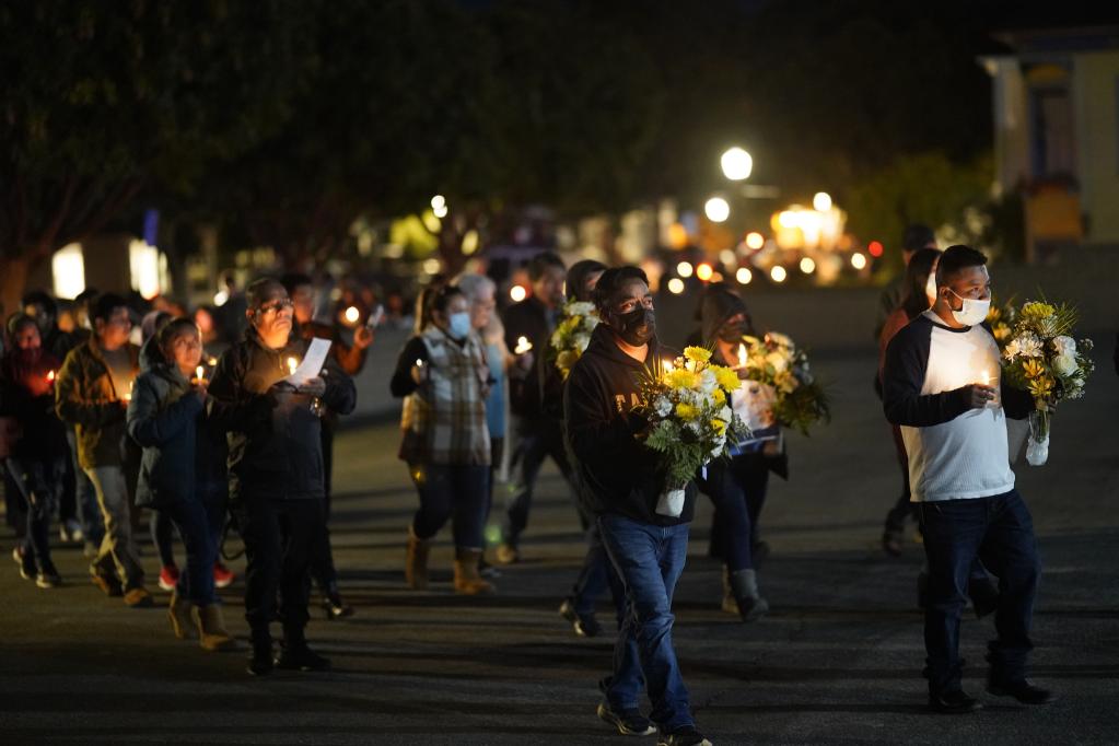 1月31日,在美國加利福尼亞州半月灣市,人們手持蠟燭和鮮花哀悼幾天前槍擊事件中的遇難者。該市1月23日發(fā)生嚴重槍擊事件,造成7人死亡、1人受傷。新華社記者 吳曉凌 攝