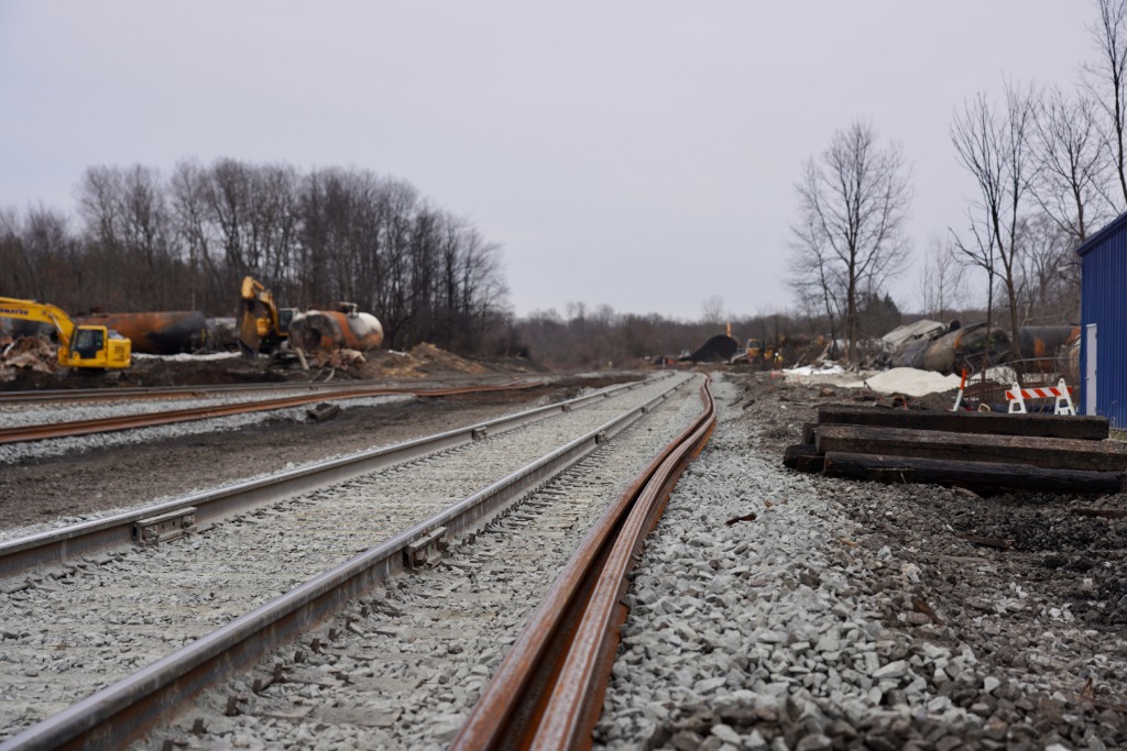 這是2月14日在美國俄亥俄州東巴勒斯坦鎮列車(chē)脫軌事故現場(chǎng)附近拍攝的鐵軌。新華社發(fā)(章焱飛攝)