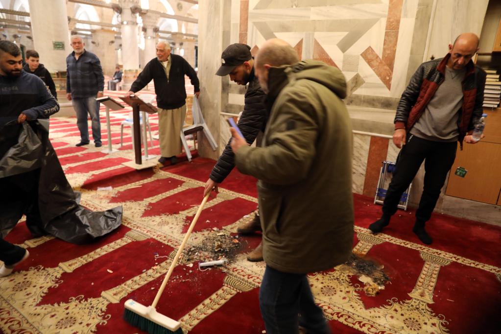 4月5日,人們在耶路撒冷老城阿克薩清真寺清理沖突現場(chǎng)。新華社發(fā)(穆阿邁爾·阿瓦德攝)