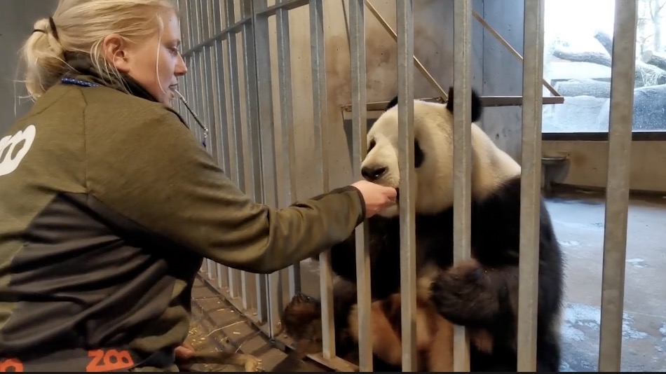 哥本哈根動(dòng)物園飼養員喂大熊貓食物。視頻截圖