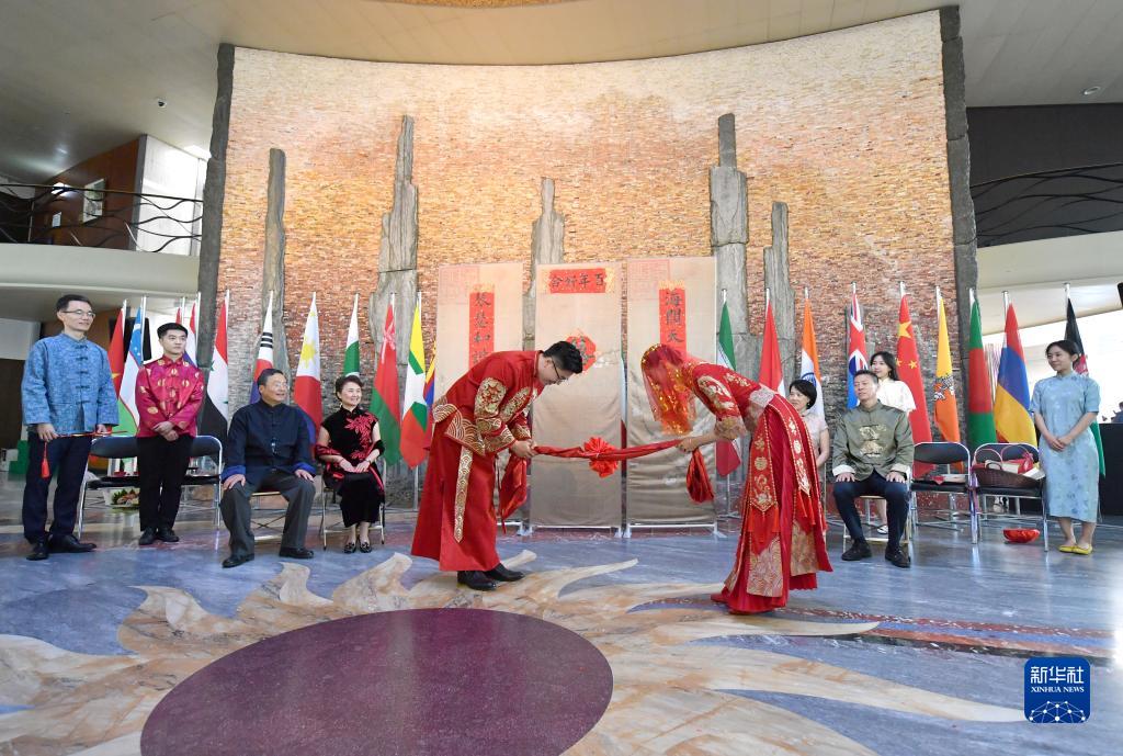 6月7日,在瑞士日內瓦,中國常駐聯(lián)合國日內瓦辦事處和瑞士其他國際組織代表團的新郎齊林和新娘張秋若在以亞洲婚俗文化為主題的第三屆日內瓦“亞洲文化節”上舉辦中式婚禮。