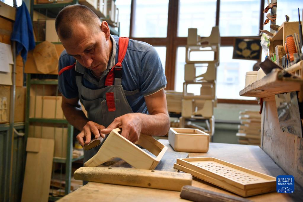 6月7日,工作人員在俄羅斯圖拉制作巴揚手風(fēng)琴琴身。