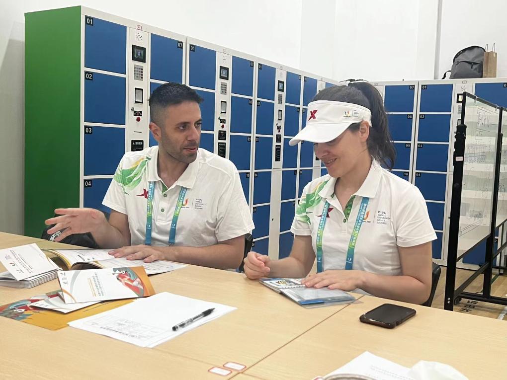 “遇到觀(guān)眾發(fā)生爭執要及時(shí)調解,如有觀(guān)眾生病可帶去場(chǎng)館內的醫療點(diǎn)救治……”身著(zhù)印有大運會(huì )“U”形會(huì )徽T恤的亞歷山德羅,對可能發(fā)生的突發(fā)情況一一作答。