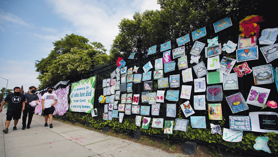 行人從美國紐約一處墓地外為新冠死者設立的紀念裝置旁走過(guò)(2021年6月14日攝)王迎攝/本刊