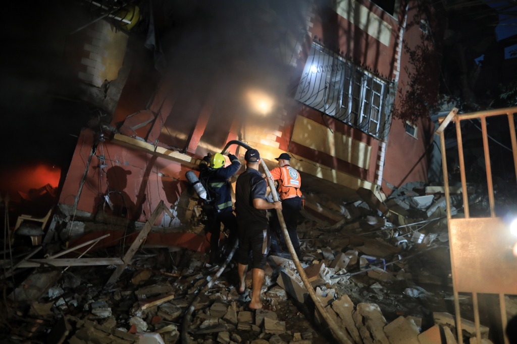 10月8日,巴勒斯坦民防人員在加沙地帶南部城市汗尤尼斯一處被以色列空襲的民宅滅火。新華社發(fā)(亞西爾·庫迪攝)
