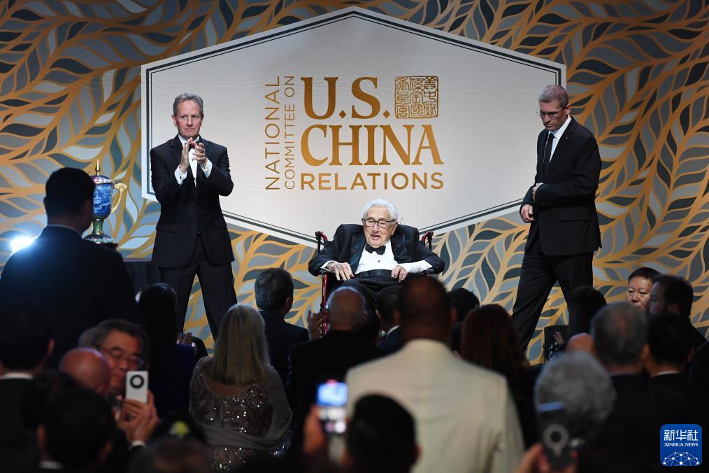 2023年10月24日,美國前國務(wù)卿亨利·基辛格(中)出席在紐約舉行的美中關(guān)系全國委員會(huì )年度頒獎晚宴。? 新華社記者 李睿 攝