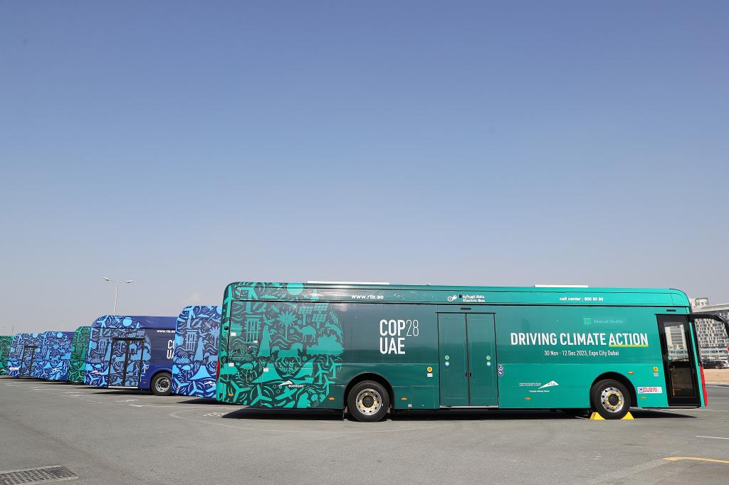 2023年12月3日,中國蘇州金龍公司的海格電動(dòng)巴士(前)??吭诼?lián)合國氣候變化迪拜大會(huì )的擺渡車(chē)停車(chē)場(chǎng)。新華社記者 王東震 攝