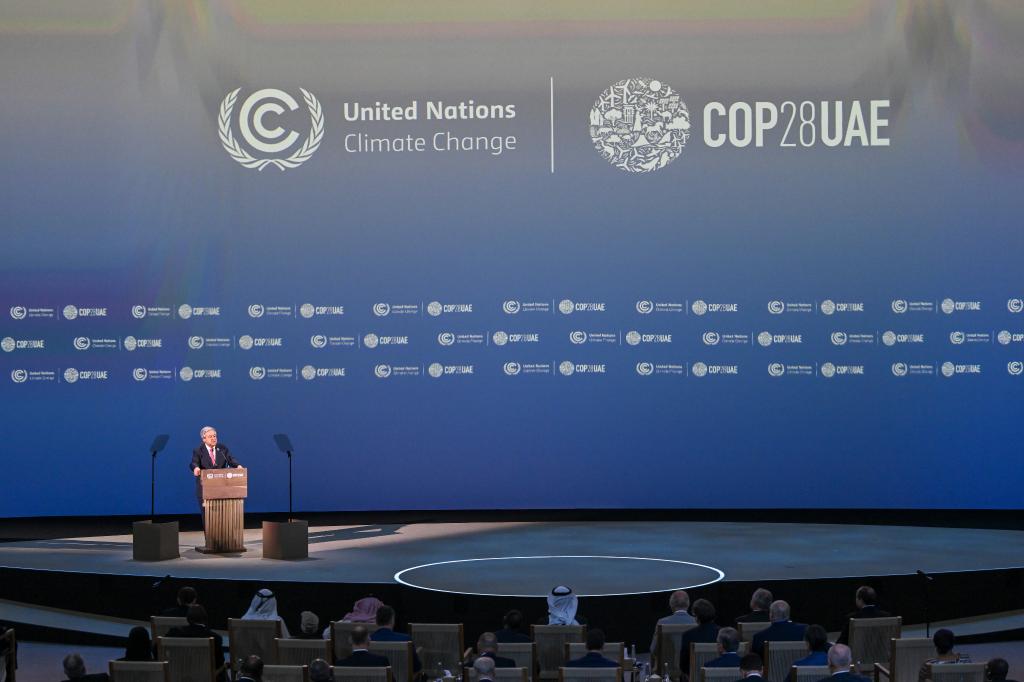 2023年12月1日,聯(lián)合國秘書(shū)長(cháng)古特雷斯在阿聯(lián)酋迪拜世界氣候行動(dòng)峰會(huì )開(kāi)幕現場(chǎng)致辭。新華社發(fā)(聯(lián)合國氣候變化迪拜大會(huì )供圖)