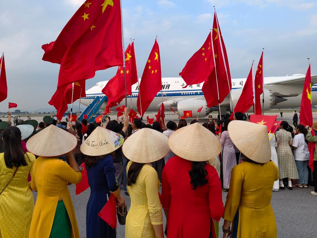 離開(kāi)河內赴機場(chǎng)途中,當地民眾和華僑華人聚集在道路兩旁,揮舞中越兩國國旗,熱烈歡送習近平總書(shū)記,并祝賀訪(fǎng)問(wèn)取得圓滿(mǎn)成功。