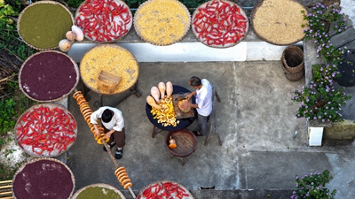 時(shí)值秋收時(shí)節,陽(yáng)產(chǎn)村村民們利用晴好天氣,將辣椒、玉米、山核桃等農作物晾曬在房前屋后,形成獨具特色的“曬秋”景觀(guān)。